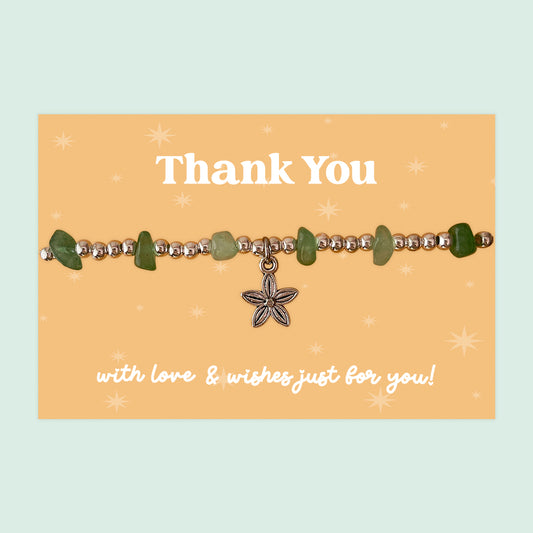 Little Wishes® “Thank You” Green Aventurine Gemstone Chip Bracelet | Silver Ball Beads & Flower Charm | Gratitude Gift for Her on Yellow Card | Appreciation, Teacher or Friend Gift