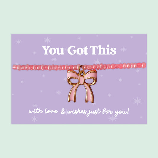 Little Wishes® “You Got This” Purple Seed Bead Bracelet | Enamel Pink Bow Charm | Uplifting Gift for Positivity, Support & Confidence | Presented on Purple Encouragement Card