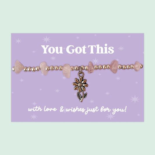 Little Wishes® “You Got This” Rose Quartz Gemstone Chip Bracelet | Silver Ball Beads & Flower Charm | Uplifting Gift for Confidence, Support & Strength on Purple Gift Card