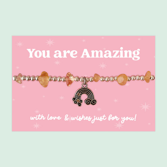 Little Wishes® “You Are Amazing” Citrine Gemstone Chip Bracelet | Silver Ball Beads & Rainbow Charm | Positivity Gift on Pink Card for Confidence, Joy & Motivation