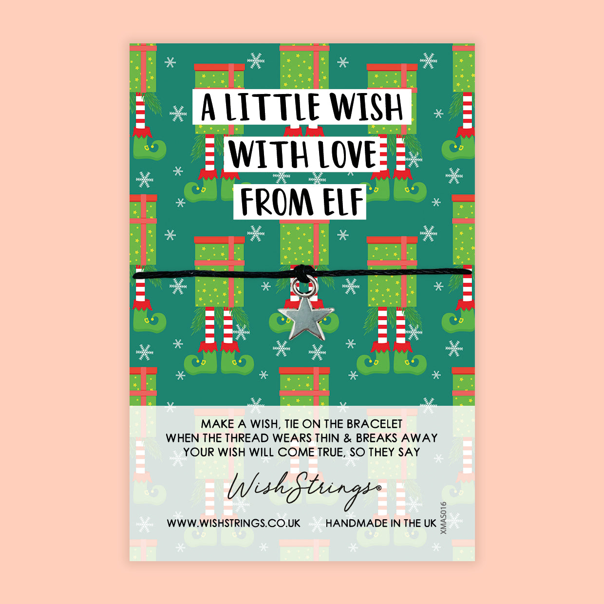 Bring a touch of elf magic to the holiday season with the “A Little Wish with Love from the Elf” Wish Bracelet from WishStrings. This enchanting festive token features a cute silver star charm, hand-tied onto strong black cord and displayed on a playful elf-themed backing card. Perfect as a little surprise from the Elf on the Shelf, it makes a lovely addition to advent calendars, Christmas Eve boxes, or as a magical morning discovery. Handmade with love, it’s a thoughtful and joy-filled way to spark imagination and festive cheer.