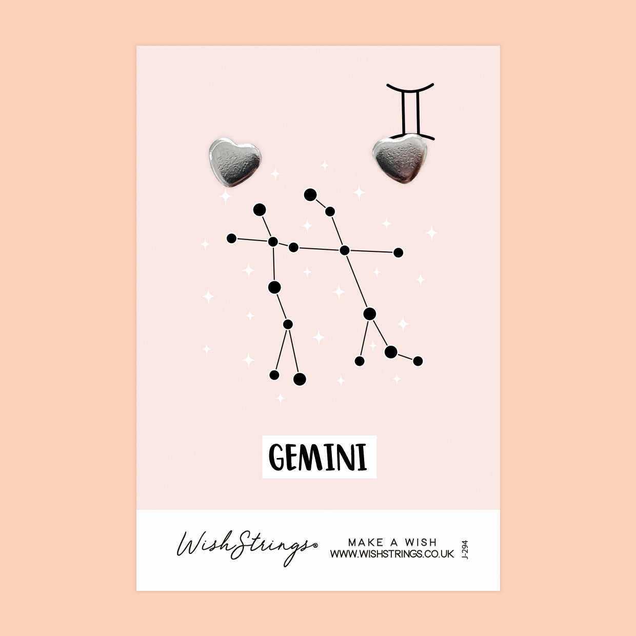 GEMINI, Star Sign Horoscope - Silver Heart Stud Earrings | 304 Stainless - Hypoallergenic