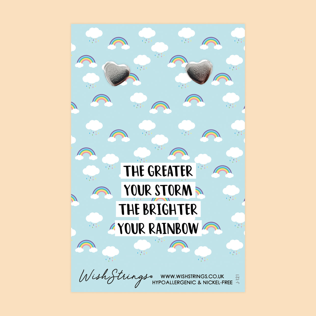 WishStrings ‘The Greater Your Storm, The Brighter Your Rainbow’ Heart Stud Earrings on Gift Card | Encouragement Gift | Hypoallergenic & Nickel-Free | Handmade in the UK