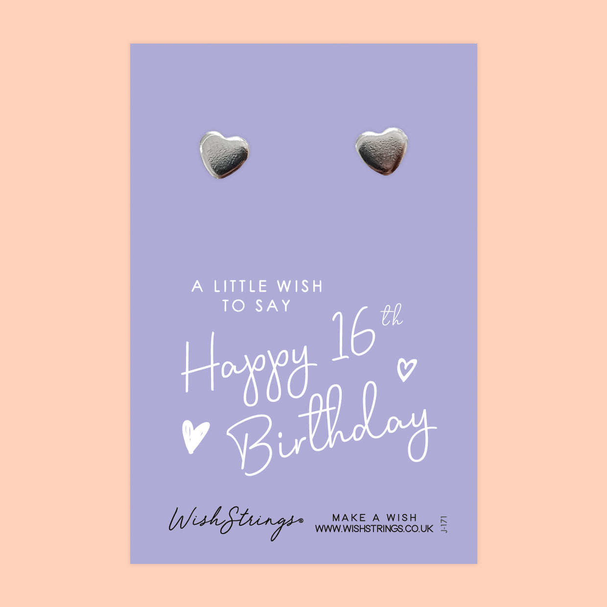 WishStrings ‘A Little Wish to Say Happy 16th Birthday’ Heart Stud Earrings on Gift Card | Sweet Sixteen Gift | Hypoallergenic & Nickel-Free | Handmade in the UK