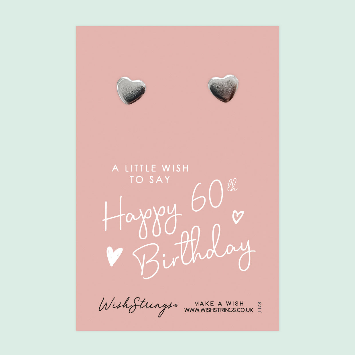 WishStrings “A Little Wish to Say Happy 60th Birthday” Heart Stud Earrings on Gift Card | Diamond Jubilee Celebration Gift | Hypoallergenic & Nickel-Free | Handmade in the UK