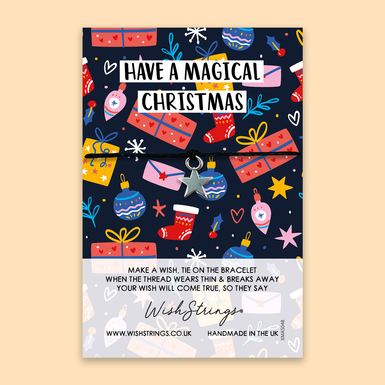 Celebrate the joy and wonder of the season with this charming ‘Have a Magical Christmas’ Wish Bracelet from WishStrings. Featuring a cute silver star charm tied on strong black waxed cord and presented on a fun festive backing card with a magical Christmas design, it’s the perfect little token of love and festive cheer. Whether slipped into a greeting card or given as a stocking filler, this handmade gift is a meaningful way to share holiday wishes and sparkle.