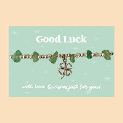 Known as the stone of opportunity, green aventurine is believed to attract luck and success, especially during times of change or new beginnings. This meaningful bracelet is presented on a charming “Good Luck” gift card, making it perfect for exams, new jobs, university, interviews, or life’s next adventure.