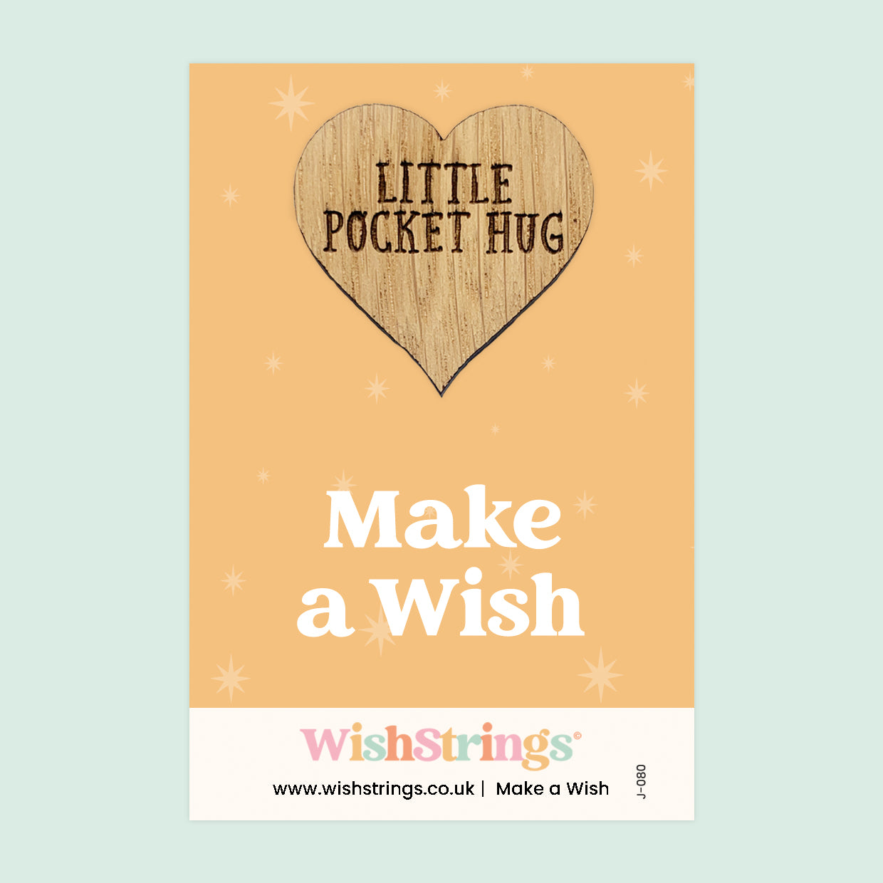 The Pocket Hug Keepsake is a beautifully crafted inspirational gift designed to bring hope and positivity to anyone who receives it. This make a wish token features a handmade wooden heart engraved with “Little Pocket Hug,” mounted on a warm orange starry background card. Measuring just 8.5 x 5.5 cm, this compact gift token is perfect for slipping into a card or pocket, offering a daily reminder of encouragement and belief in oneself.