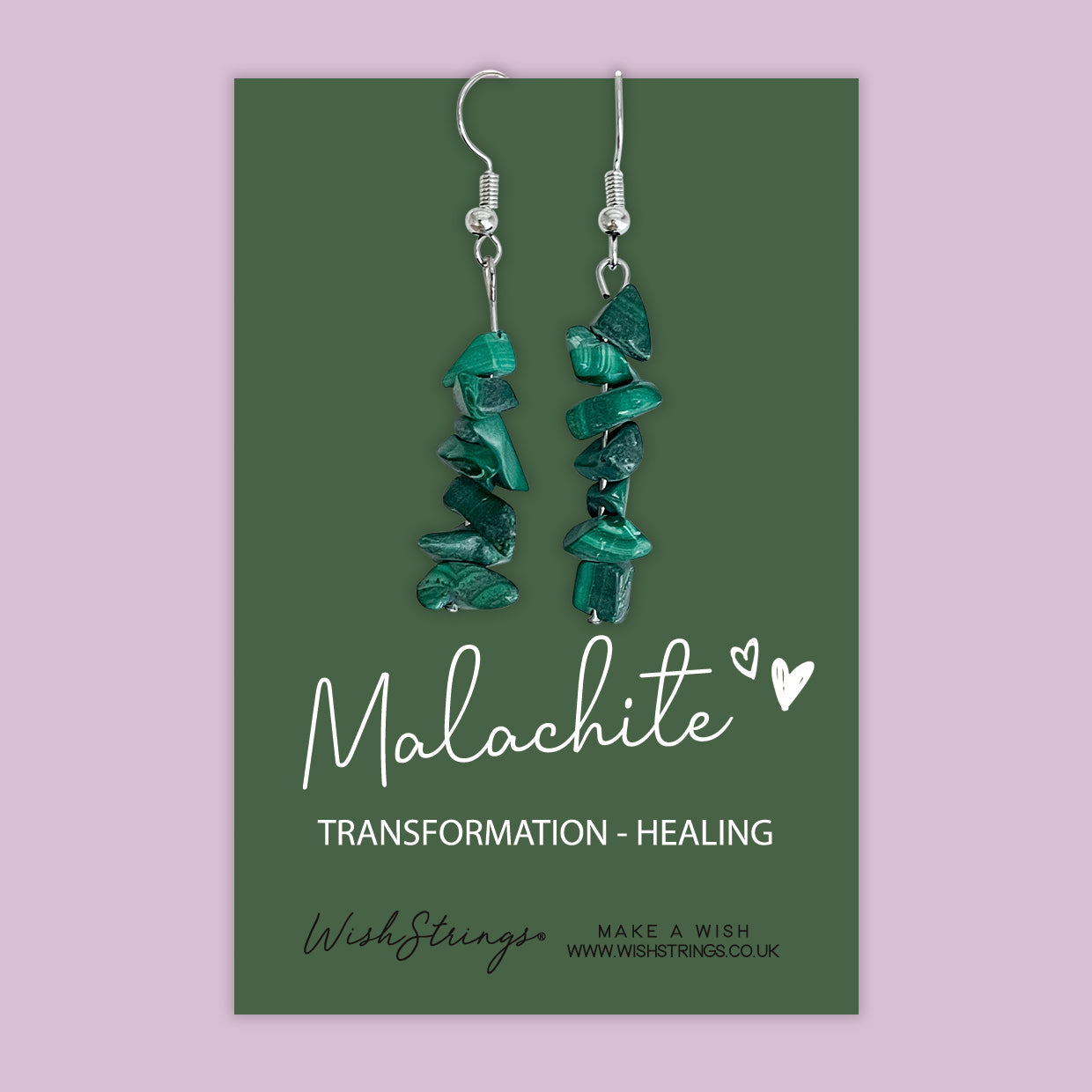 Crystal chip dangle earrings are small tumbled pieces of crystal strung together on a Brass ear wire. Our gemstone earrings are presented on a bold, beautiful gift card.