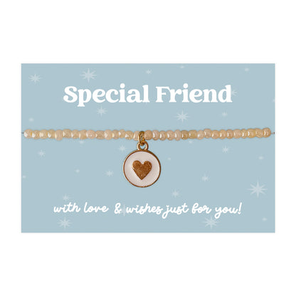 Crafted with soft peach-coloured seed beads and a sweet enamel heart charm, this bracelet is a modern, lightweight accessory presented on a charming “Special Friend” gift card — ideal for birthdays, thank-you moments, or simply to say “I’m thinking of you.”