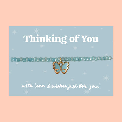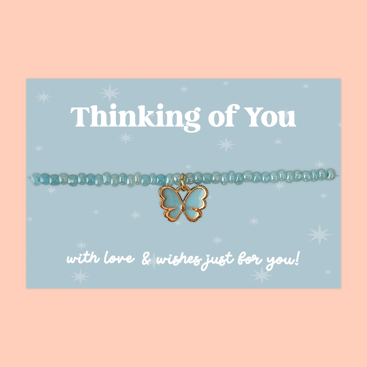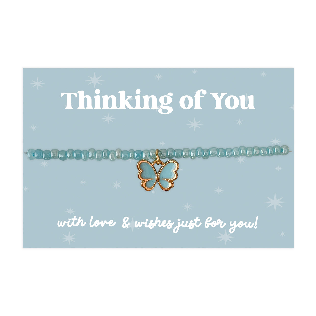 Little Wishes® “Thinking of You” Blue Seed Bead Bracelet | Enamel Butterfly Charm | Comfort Gift for Tough Times, Sympathy & Emotional Support on Blue Gift Card