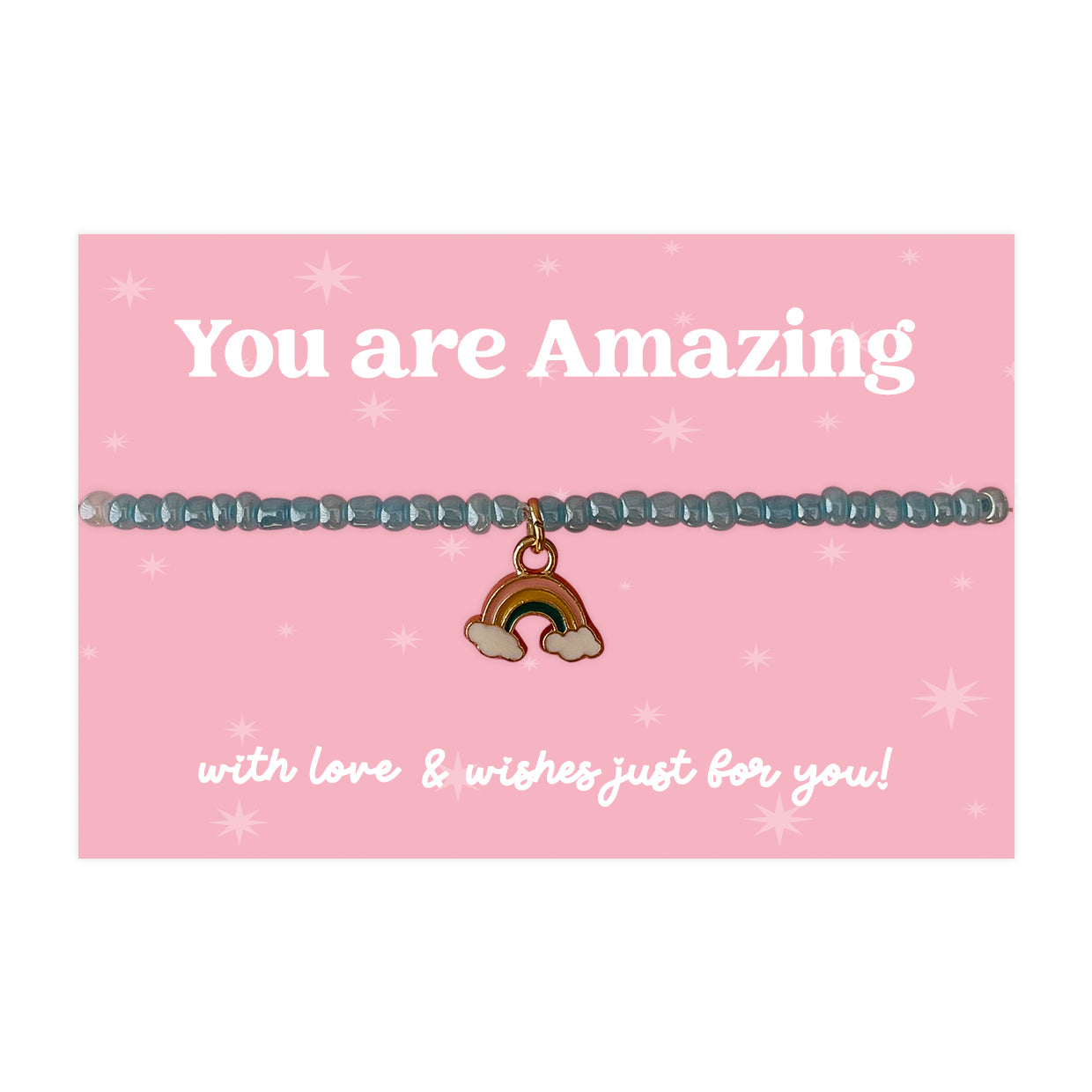 Little Wishes® “You Are Amazing” Blue Seed Bead Bracelet | Pastel Enamel Rainbow Charm | Positivity Gift for Confidence, Support & Joy | Presented on Pink Gift Card