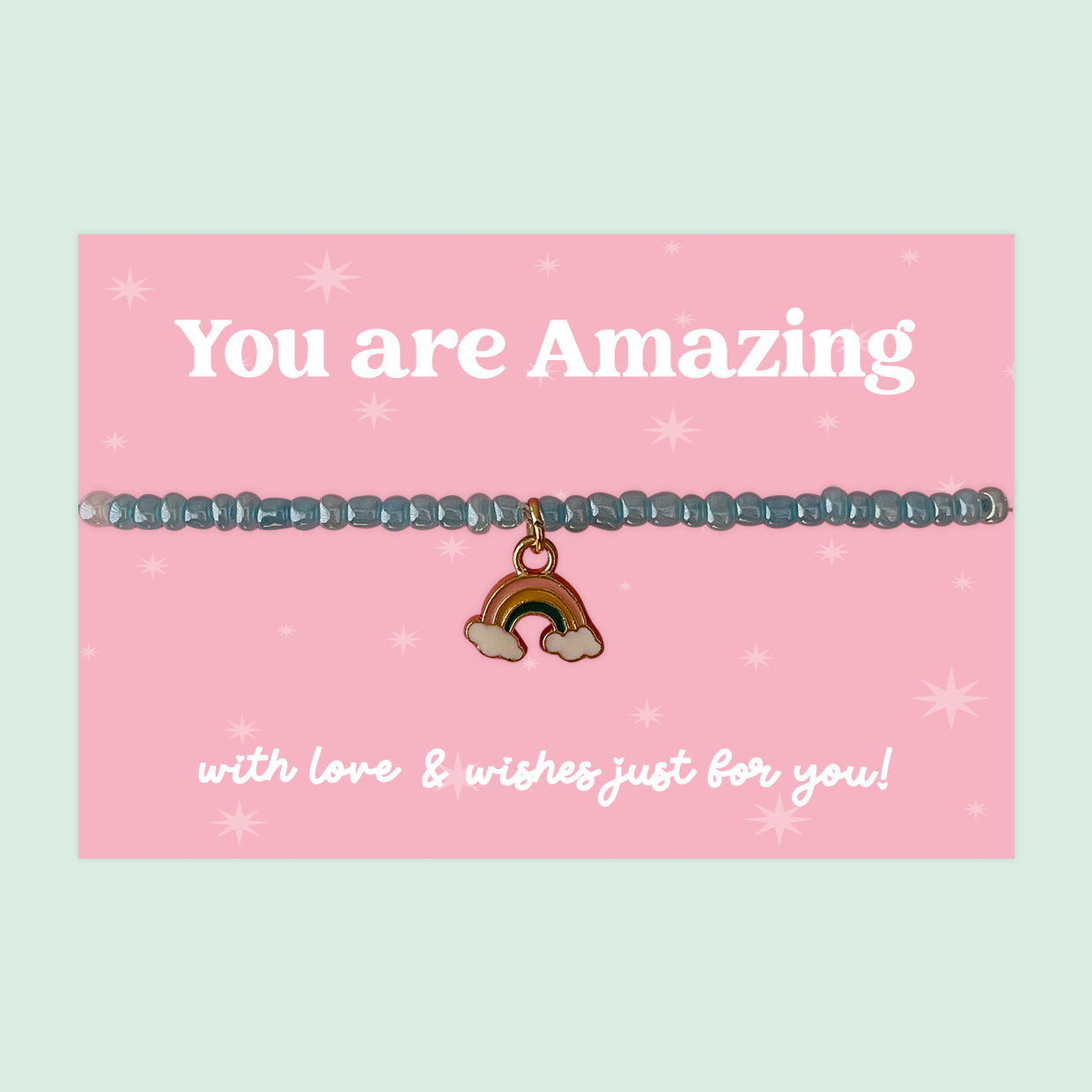 Featuring blue seed beads and a soft pastel enamel rainbow charm, this bracelet is a fun and heartfelt reminder of how amazing they truly are. Rainbows symbolise hope, joy, and better days ahead — making this bracelet a perfect pick-me-up for anyone in need of encouragement or celebration.