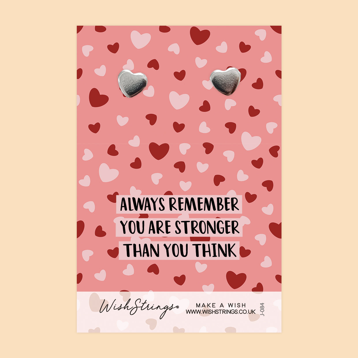 WishStrings® ‘Always Remember You Are Stronger Than You Think’ Heart Stud Earrings on Gift Card | Empowering Gift for Her | Hypoallergenic & Nickel-Free | Handmade in the UK