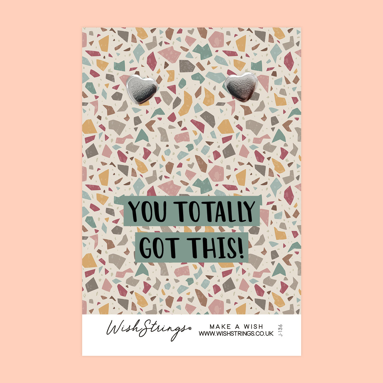 WishStrings ‘You Totally Got This’ Heart Stud Earrings on Gift Card | Motivational Gift for Confidence & Support | Hypoallergenic & Nickel-Free | Handmade in the UK